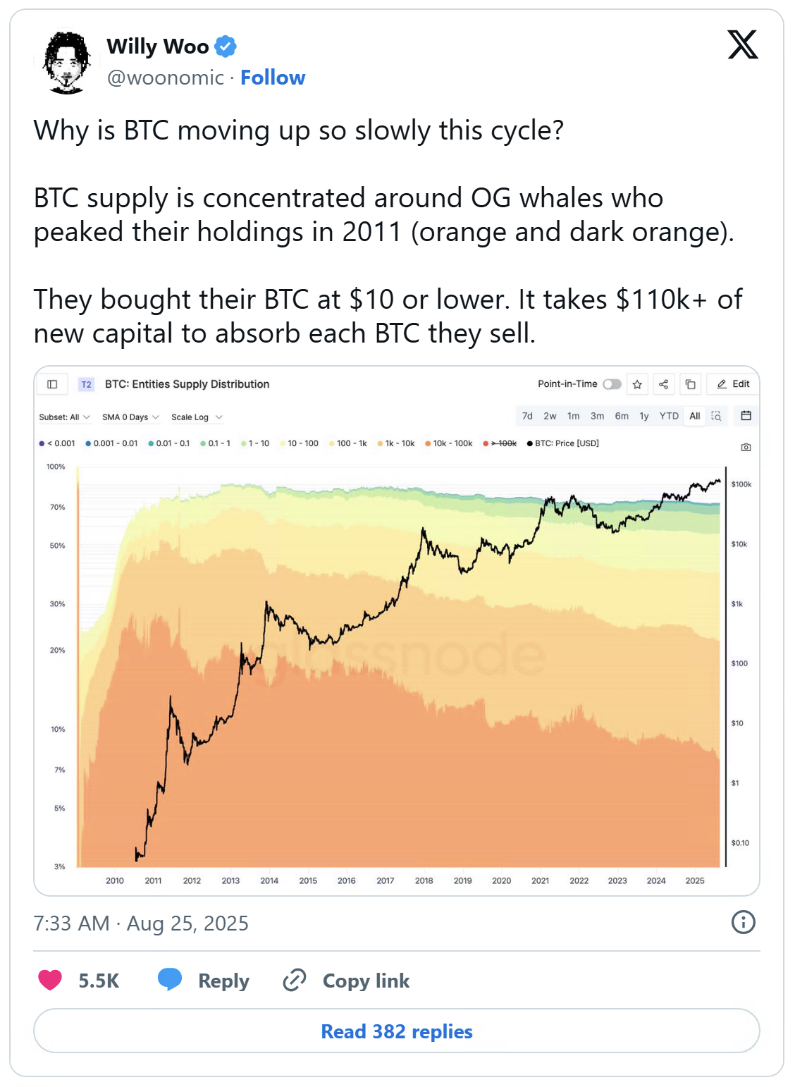 据知名比特币支持者Willy Woo表示,本轮周期中BTC上涨缓慢的原因在于其供应集中在2011年就达到持仓高峰的大型鲸鱼手中。