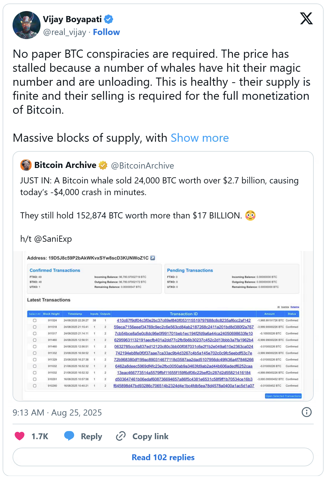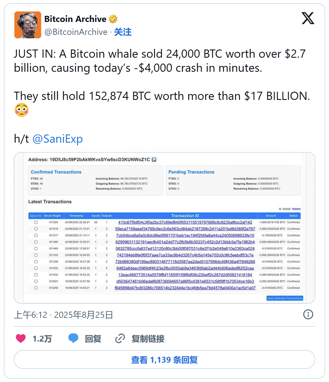 这名巨鲸在周日卖出了24,000枚比特币,价值27亿美元,几分钟内引发比特币价格暴跌4,000美元。然而,他们仍持有152,874枚比特币,价值超过170亿美元。